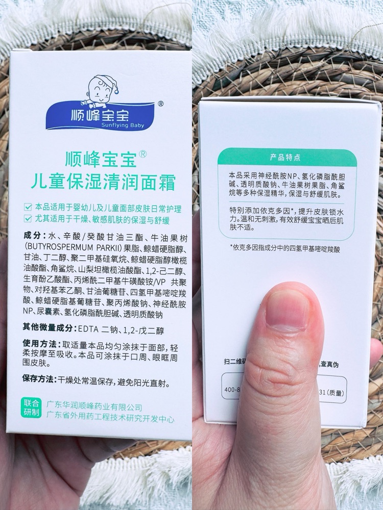 收到妈妈网的顺峰宝宝儿童保湿清润面霜试用,真的太惊喜啦!作为新手妈妈,给宝宝选面霜一直是件头疼的事,尤其是我家宝宝皮肤比较娇嫩,换季或者晒后很容易泛红、干燥,这次能被选中试用,真的很期待。 收到快递后,包装很严实,面霜的盒子设计得很...