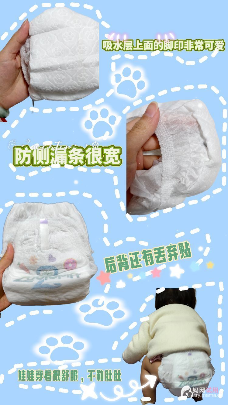 这款拉拉裤一包里面有两个图案都非常好看,而且它的吸水层还是脚印形状的非常可爱,吸水效果也很好一晚一片完全不用担心会漏,两侧的防侧漏条也比较宽防侧漏效果挺好的,不用担心尿尿或者便便从大腿根部渗出弄脏裤子,腰上有大透气孔比较排汗爱动的宝宝穿上也很友好,不用担心闷汗让宝宝产生不舒服,整体来说呢他穿着就是很舒服腰围弹性大不勒小肚肚,面料很柔软皮肤敏感的宝宝也可以穿不用担心因为摩擦把皮肤弄红,背后还有六七条丢的时候呢就很方便,成体来说比较推荐,尺码合适不用特地拍大一码