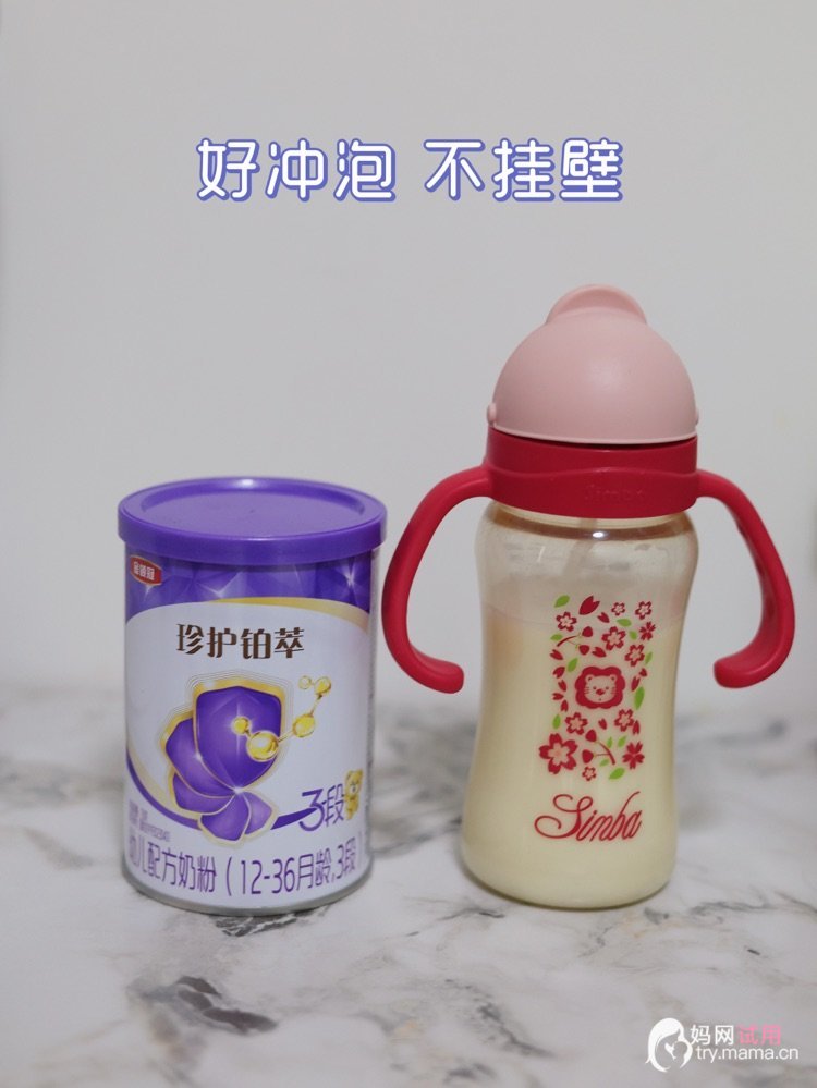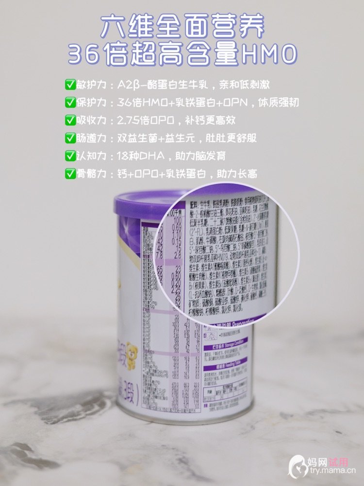 先说粉质和口感,这是我选奶粉很看重的地方。升级后的珍护铂萃粉质更细腻蓬松,手感顺滑不易结块,闻起来是淡淡的天然乳香,没有香精的甜腻感,也没有刺鼻的奶腥味。冲泡也很省心,45℃左右温水冲调,轻轻摇晃就能充分溶解,不挂壁、不沉淀,冲奶特别轻松。宝宝接受度也很高,口味清淡接近母乳,从旧版转新版完全不抗拒,每天奶量依旧很稳。 再说说这次升级的配方,直接覆盖了宝宝六大成长营养需求,每一处升级都很用心。让我最放心的就是保护力方面,HMO含量提升至36倍,还配有专属HMO乳源专利,给宝宝更强的守护。吸收方面也很贴合娇嫩肠胃,OPO含量升级到6.6g/100g,营养吸收率高达98%,再加上双重益生菌与高含量益生元,肠道呵护更到位。