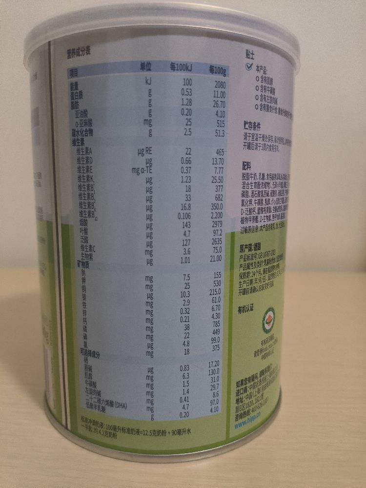 粉质细腻,颜色淡黄,味道恬宜,口感清甜,宝宝很喜欢,日常吵着要喝,一直给他配这一款。奶粉溶解很快,质量好,售后有保障,妈妈放心,家人安心。99%农业原料有机,100%有机乳源GOS,100%有机乳糖配方,好吸收,轻负担,不上火,比欧盟有机标准更严格!每天加餐...