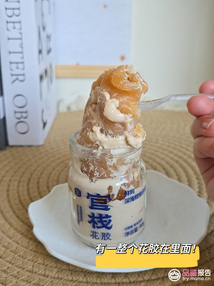 以前买过干的,泡发,煮,挺麻烦的,自己弄不好还腥。 但官栈的即食花胶,确实不一样。 · 开盖即食:不用煮、不用泡、不用洗,拧开就能吃。对孕期懒人来说,简直是救命设计。